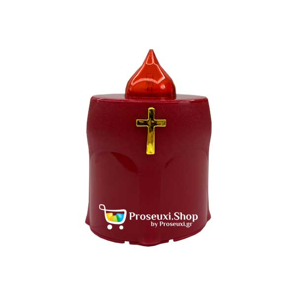 Ηλεκτρικό κερί με Σταυρό σε χρώμα κόκκινο. Διαθέτει 2 ενσωματωμένες μπαταρίες τύπου ΑΑ και μόλις τεθεί σε λειτουργία διαρκεί για περίπου 150 ημέρες.
